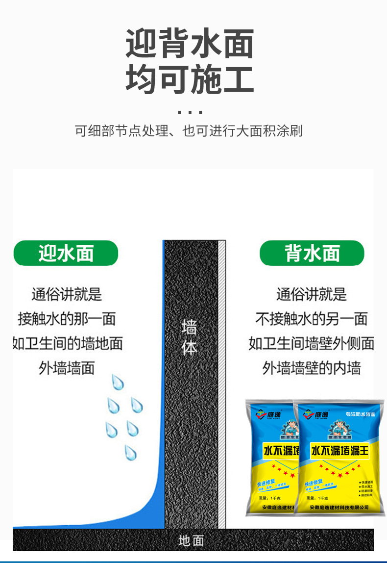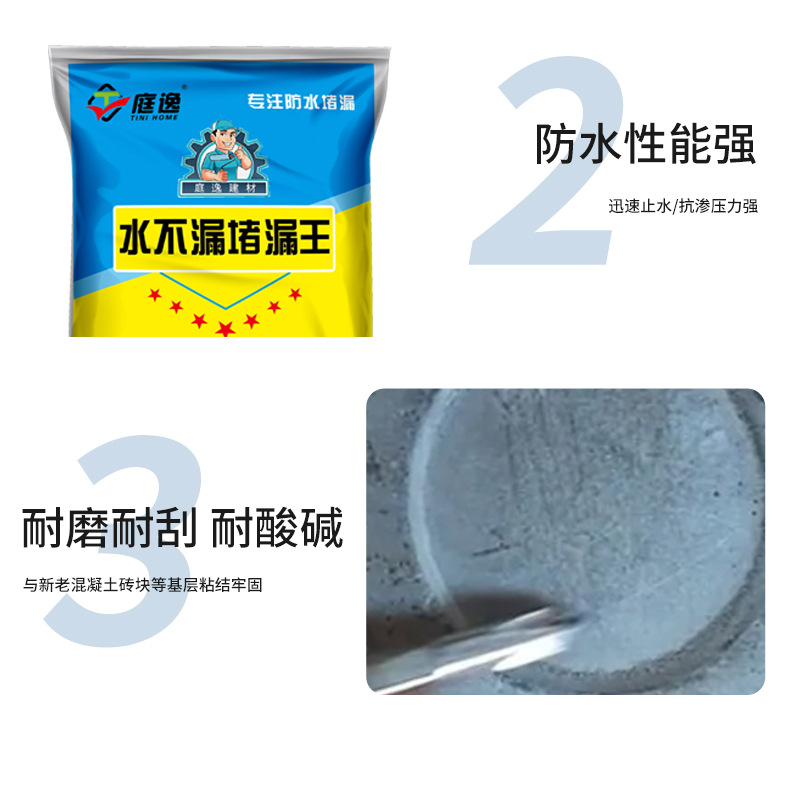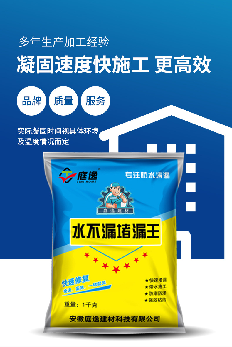 堵漏王用于防水工程,带水带压,立刻止漏.本产品操作简单,仅加水调和即可使用,无毒、无害、无污染.可加入硅酸盐水泥调整缓凝时间.与建筑物同等寿命。