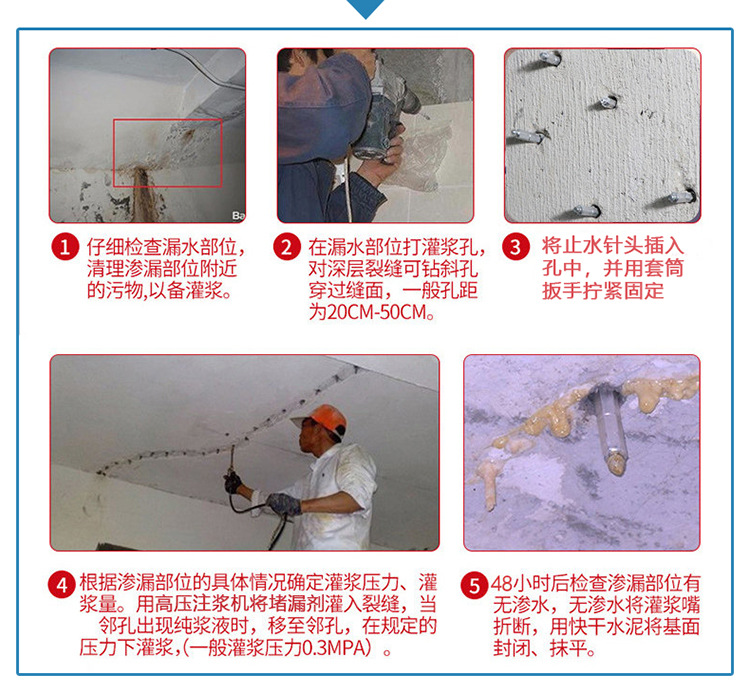 高压注浆堵漏是通过专用设备将聚氨酯、环氧树脂等防水材料以高压(通常300-500kg/cm²)注入混凝土裂缝或孔隙中。材料遇水后发生交联反应,膨胀形成弹性体,填充所有缝隙并固化,达到止水目的
